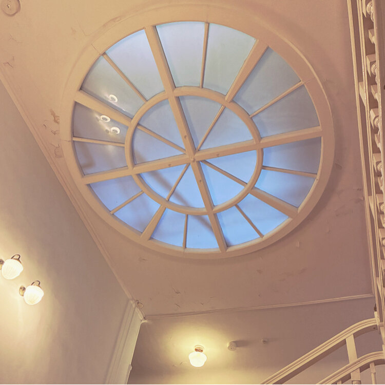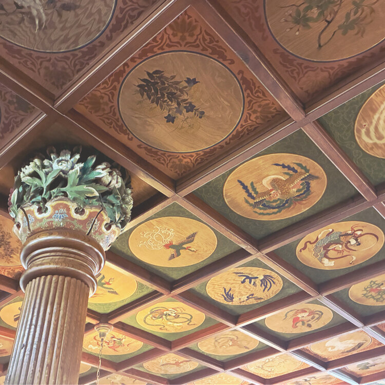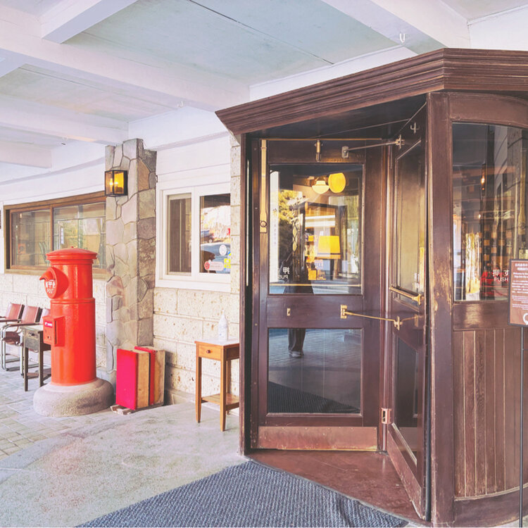 回転ドアに大谷石の壁 メインダイニング前にあるランプに天井 手紙を書くための机 どこを見てもロマンティック