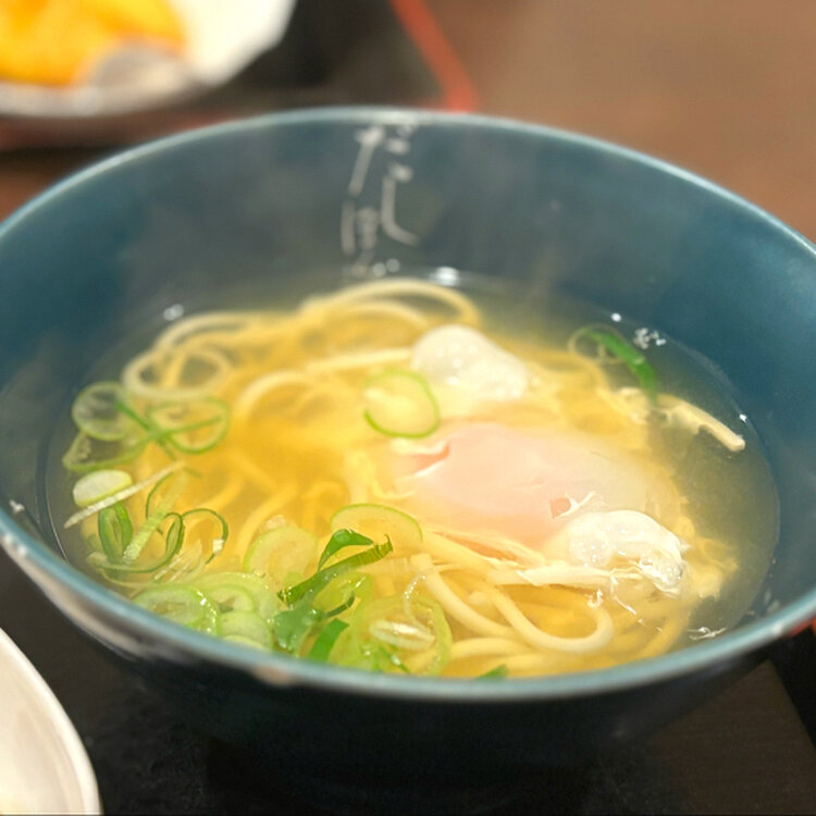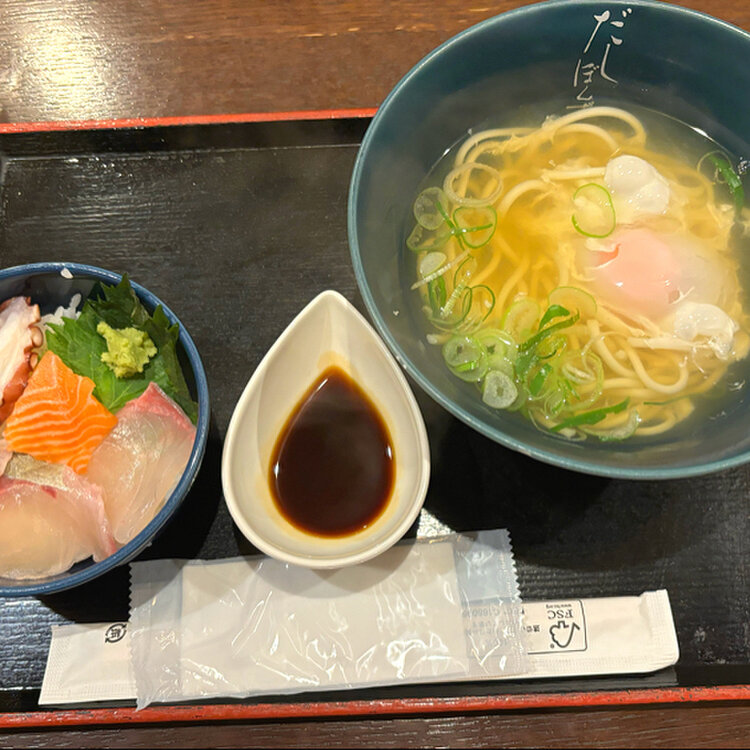 月見うどんの麺半玉にミニ海鮮丼をセットに。