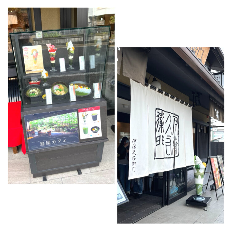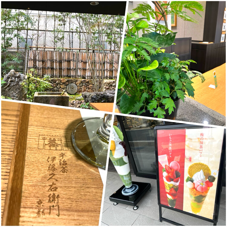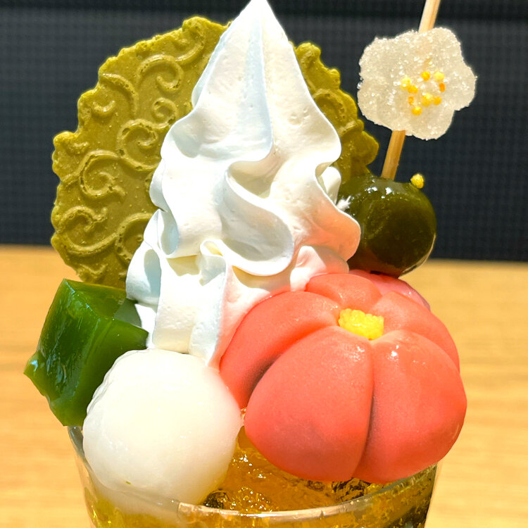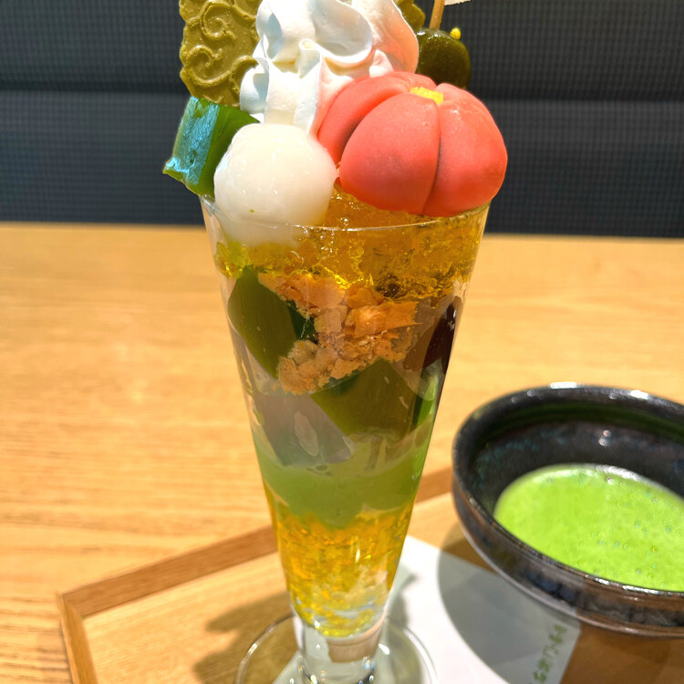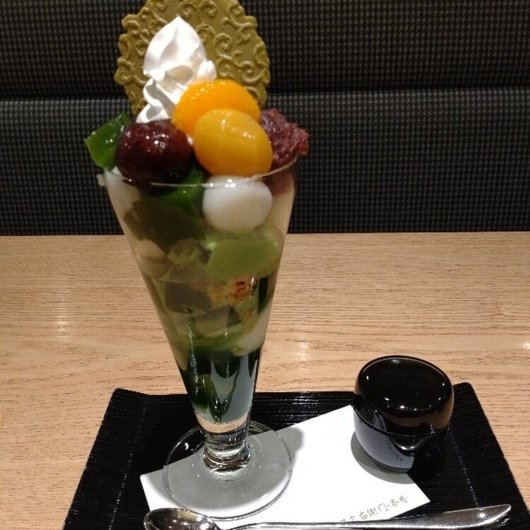 期間限定の梅抹茶パフェのお花のお団子が可愛いくて、こちらとお抹茶のセットにしました.