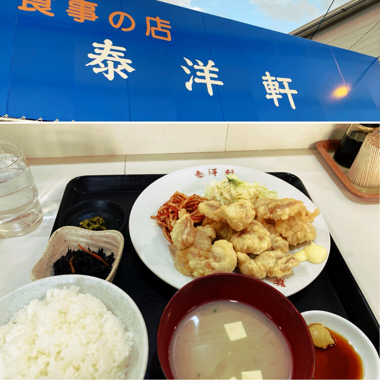 お食事の店 泰洋軒で とり天定食 開店前に到着すると、お店の前に10人ほどの列。 一番人気だというとり天を注文。 ボリュームのとり天で女子には多めで😅 メニューが豊富で、人気の定食屋さんでした。 あとで聞いたところ、地元サッカークラブのアビスパ福岡の選手御用達だそうです😂 #福岡市東区 #名島 #泰洋軒