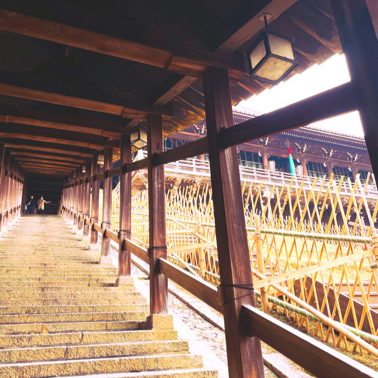 二月堂へ上堂するために長い階段(登廊)を上る練行衆の足もとを照らすためのお松明🔥