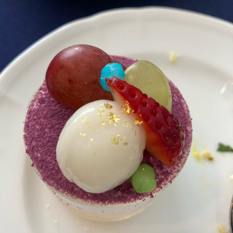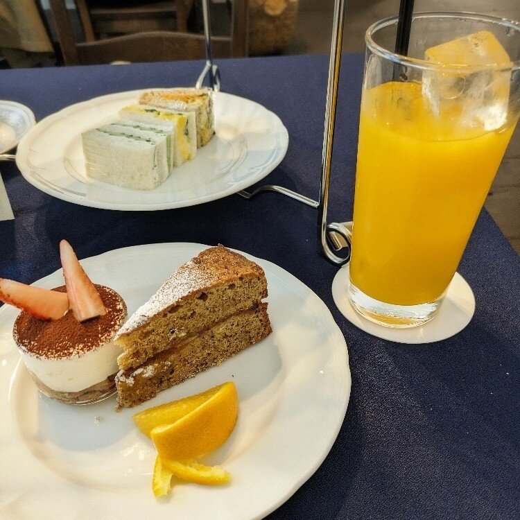 スイーツは紅茶の茶葉を含んだ生地のヴィクトリアケーキ、苺のティラミス、カットフルーツ🍊