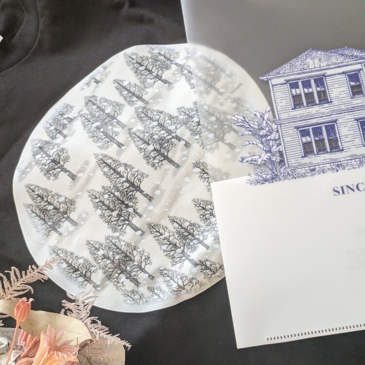 素敵な森のイラストのTシャツ、邸宅オリジナルの葉書等を購入、僅かながら維持費募金箱にも♡