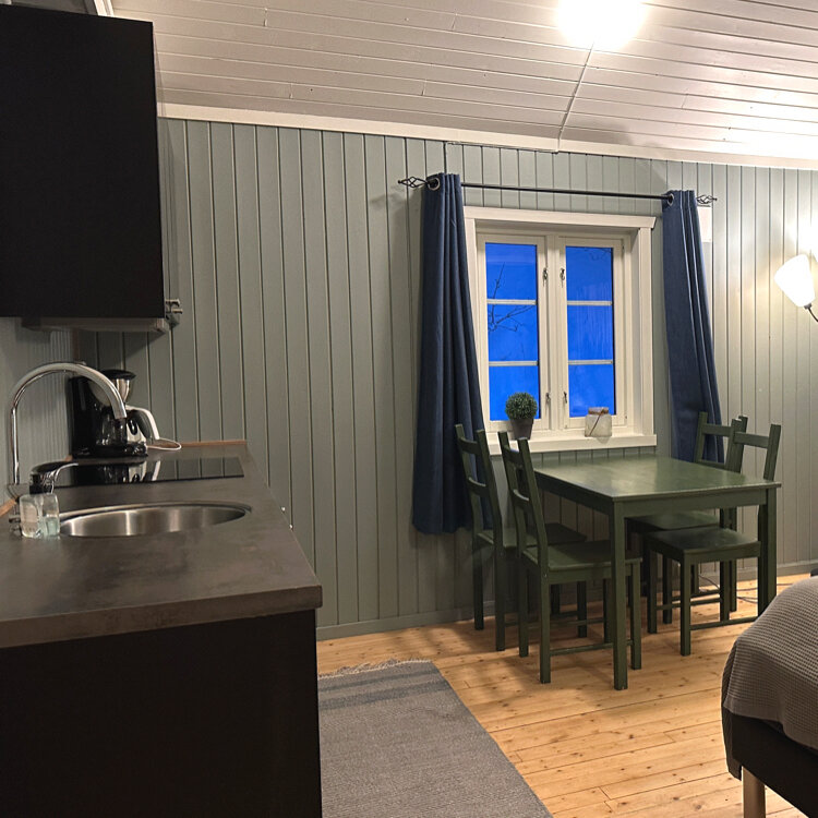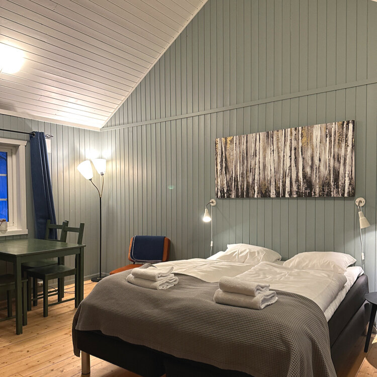 ソールヴォーゲンで泊まったキャビン、窓の外に朝の絶景が広がっていて、慌てて朝のおさんぽへ。
