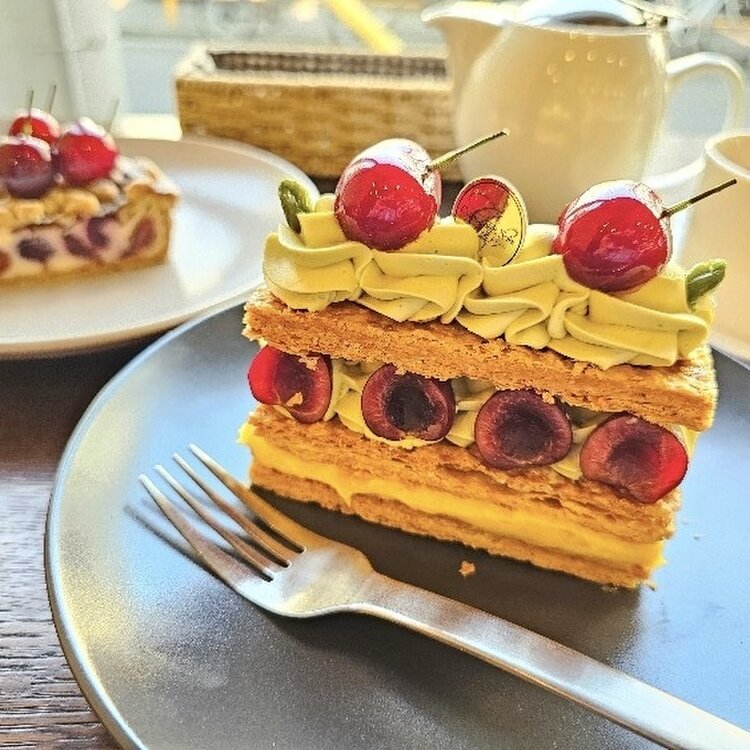 ナポレオンパイ🥧🍪🍓は周りがスライスアーモンド🥜で覆われていて、中にはパイ生地🍪とたっぷりのカスタードクリームがミルフィーユのようにサンドされてとても美味しいケーキでした💓😋🍴