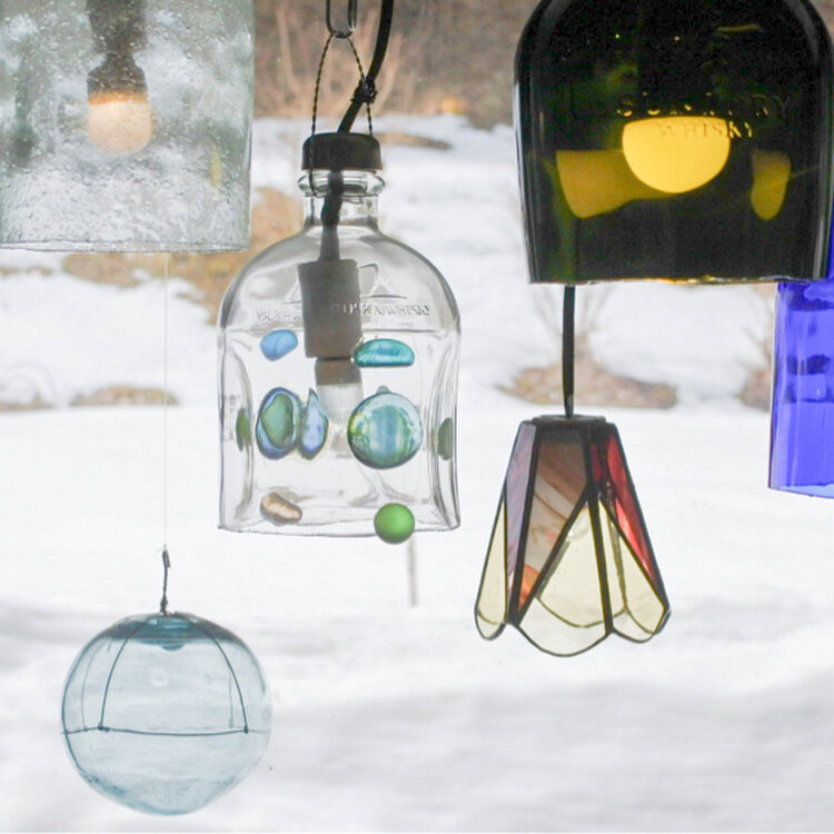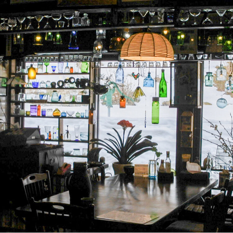 食堂の窓辺にはボトルを切り抜いたランプがたくさん。外の雪景色とランプの色合いがとても綺麗✨