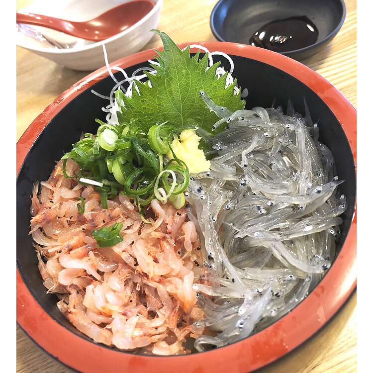 沼津港の市場で生桜エビと生しらすの丼をいただきました。新鮮なエビ🦐としらすは最高でした♪😍