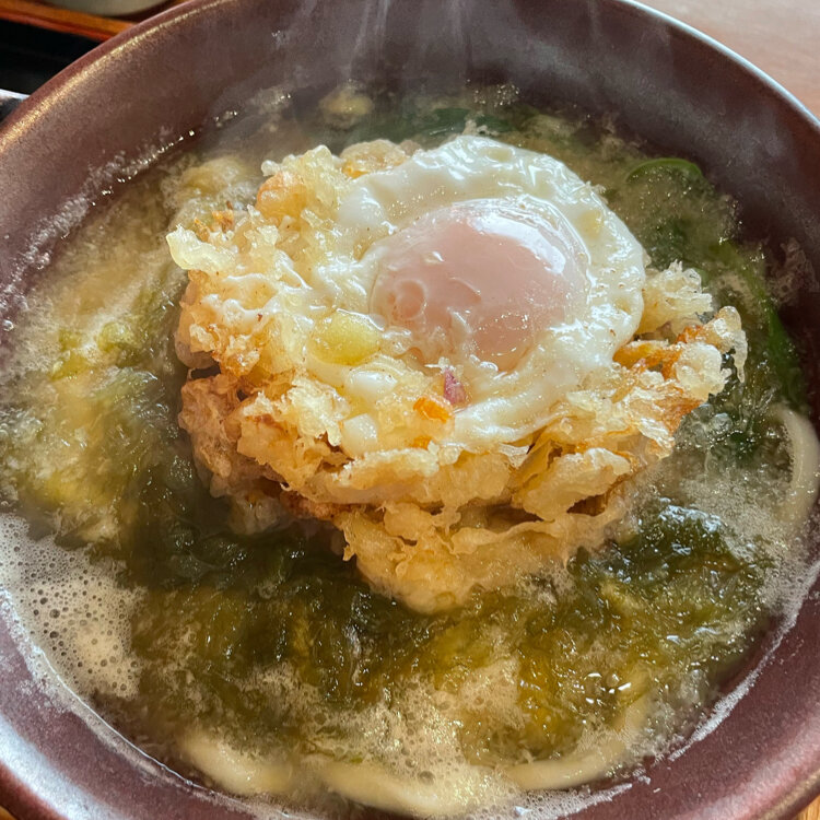 ・小海老のかき揚げ、玉子、揚げ醤油餅、白葱、あげ