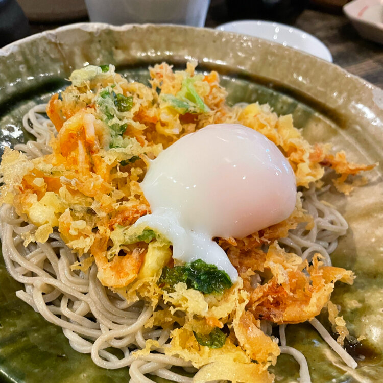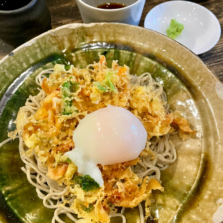 メニューが豊富で凄く迷いましたが、私は季節限定の「桜海老と菜の花のかき揚げ」がのった冷たいお蕎麦にしました。かき揚げは熱々サクサクで、お蕎麦は注文が入ってから目の前でゆがいてくれたので、ワクワクが止まりませんでした。