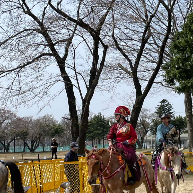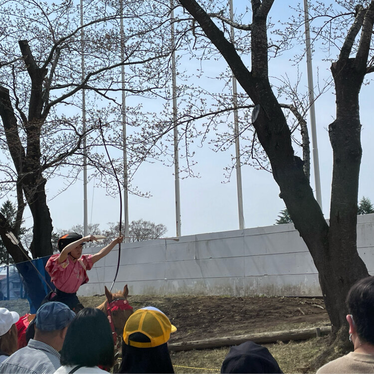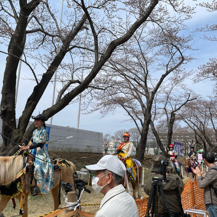 まだ蕾の桜でしたが、十和田市さくらまつりの期間中、桜の下で行われる桜流鏑馬を見てきました。うまく写真が撮れませんでしたが、馬が目の前で走り、的に矢がバンバン当たる様は迫力満点!的に矢が当たると和傘が開くというのもとっても風流☺️桜流鏑馬は、女性騎手による流鏑馬で、艶やかな衣装も見ていて楽しいです。ヘルメットも帽子風に意匠が凝らされており、馬もフリフリとおめかししていました。まつり期間中なので、出店もあり、天気がよくて楽しめました🌸