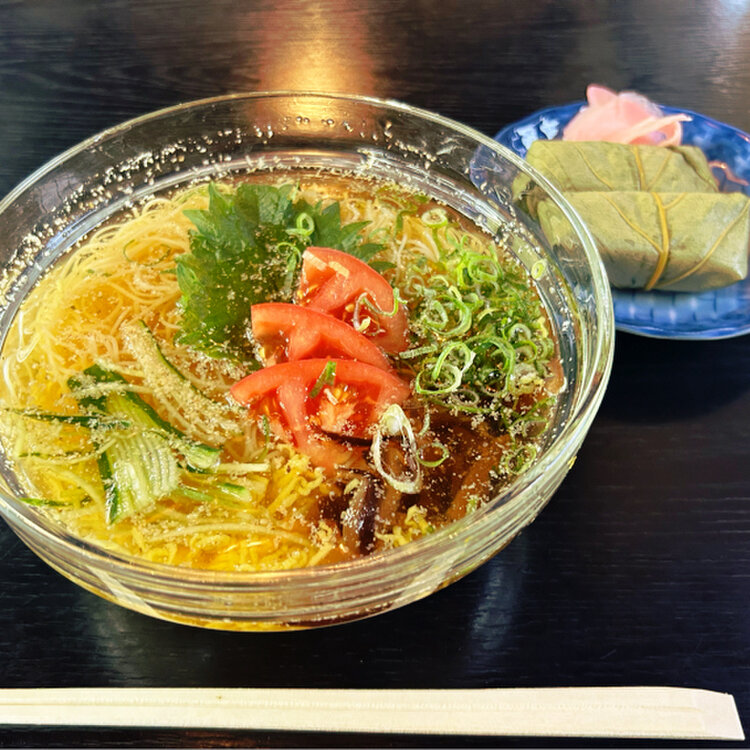 奈良旅行2 「三輪そうめん福神堂」で三輪そうめんと柿の葉寿司☺️ 三輪そうめんはぶっかけでいただきましたが、コシがあって美味しかった!お土産でも買いました。