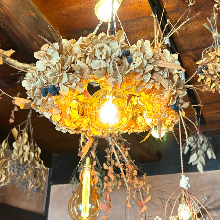 いちごさん こんばんは🌙 ドライフラワーのお店、素敵ですね✨ 古民家にドライフラワー💖 小さなものから、大きなリースまで、たくさんありますね❗ 好きなお花で、作ってくれるのも嬉しいですね💕 素敵なお店は、見てるだけでも癒されますよね🎵