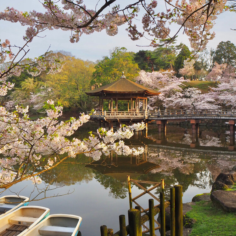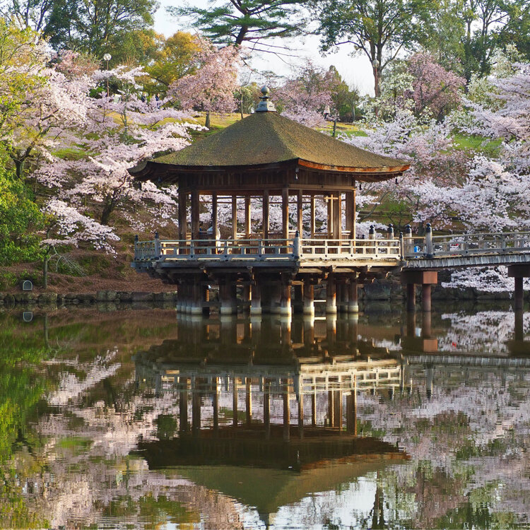 朝日に照らされた浮見堂と桜。 📷2024.4.7 #奈良#奈良公園#浮見堂#奈良市#Ayu桜#リフレクション#春色さがし