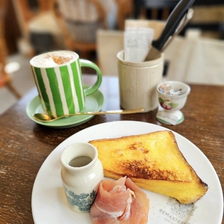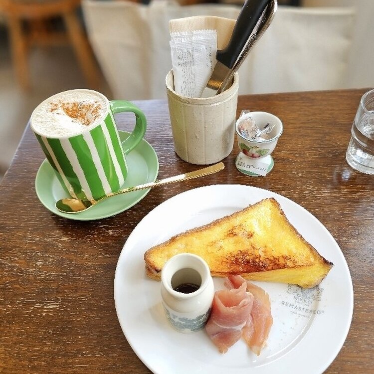 ふわふわのフレンチトーストにメープルシロップをかけて、お皿に添えてあった生ハム🥩ものせて一緒にいただきます😋🍴