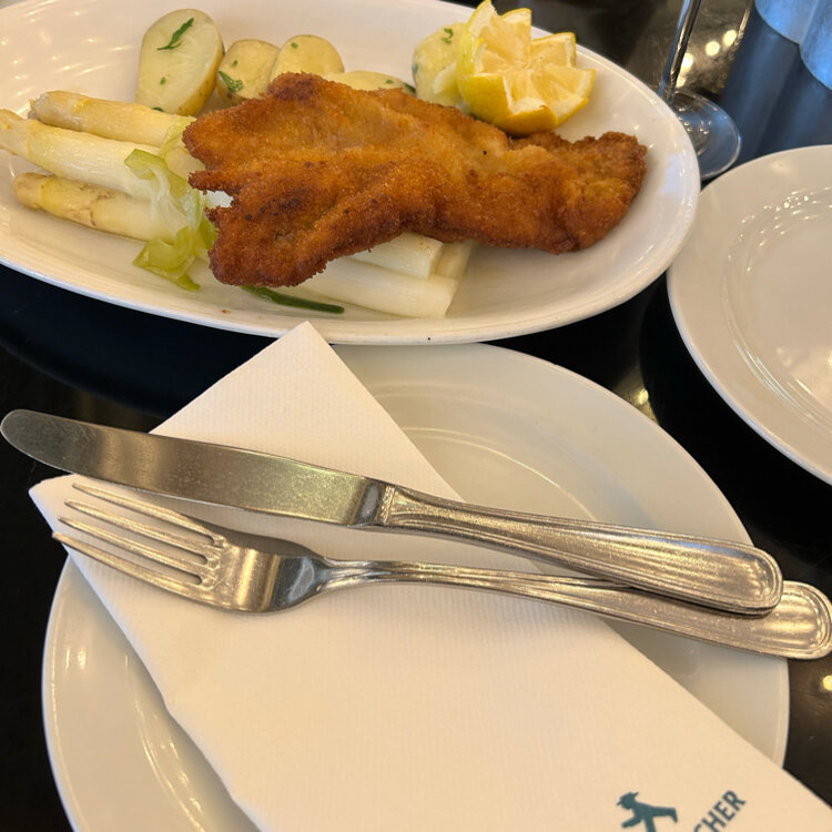 春のドイツに欠かせないシュパーゲル(ホワイトアスパラ)にハーフサイズのシュニッツェルを食べました。