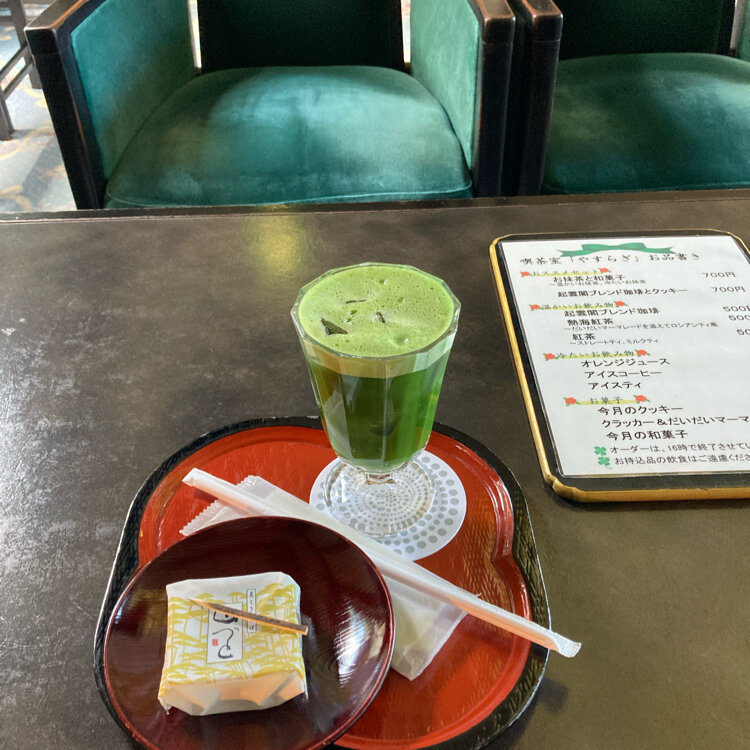 熱海 起雲閣の喫茶室 アイスの抹茶🍵をオーダー これがめっちゃ美味しい〜〜😳 室内もレトロなインテリアで落ち着きます。 団体さんがきたので早々に退散。 また行きたいな #電車旅 #抹茶のとりこ #熱海#各駅停車の旅#東海道線#起雲閣#喫茶室やすらぎ