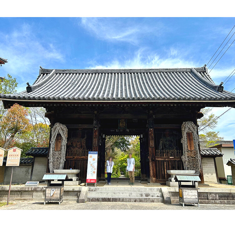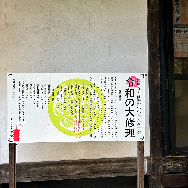 仁王門の向こうは花が咲き乱れ楽園のような道を歩いて本堂へ。太子堂には大師伝説の一場面が描かれた額がかけられていました。五重塔、そして、2025年開創1400年。令和の大改修も行われていました。