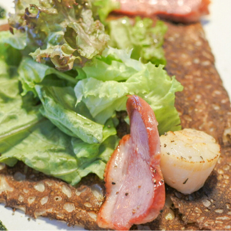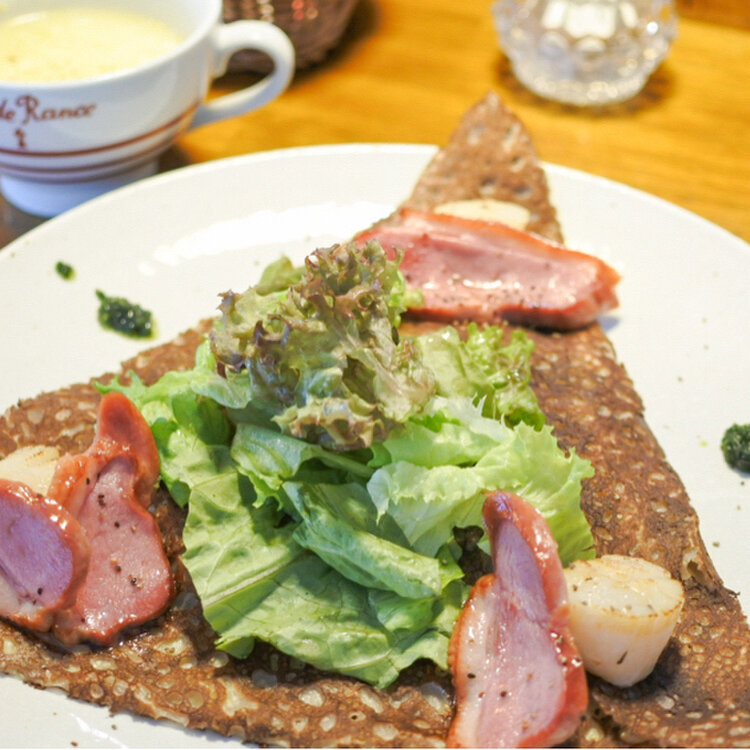 前のお店でクリームソーダとガトーショコラとクッキー食べてきたけど、せっかくのランチタイムだったので、帆立とカモのガレットをいただきました。