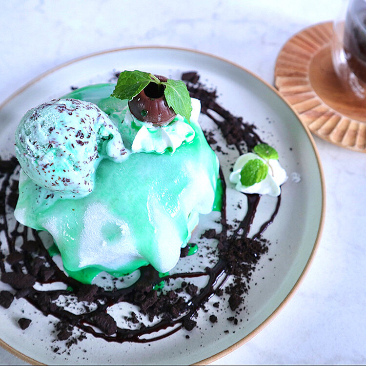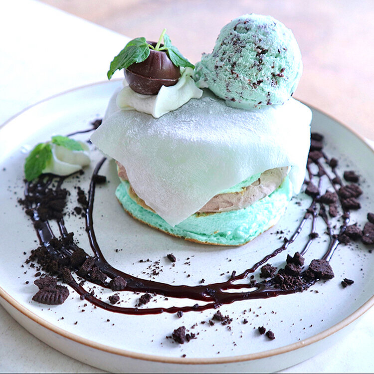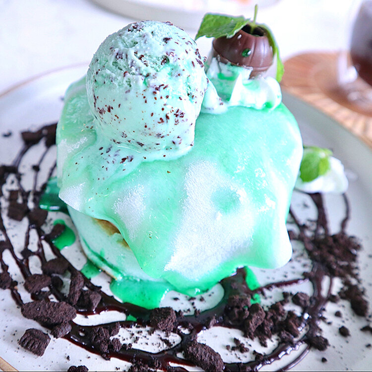 ミントカラーがかわいいミントパンケーキはひんやり冷やされています🩵