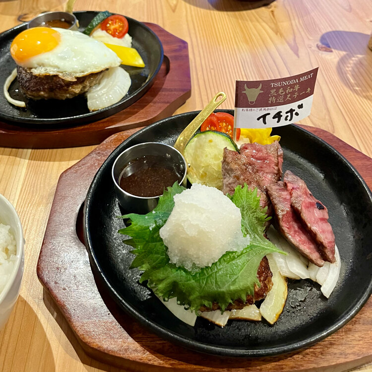 コンビ和牛特選ステーキセットとデミグラスハンバーグの目玉技焼きトッピングを頼みました。