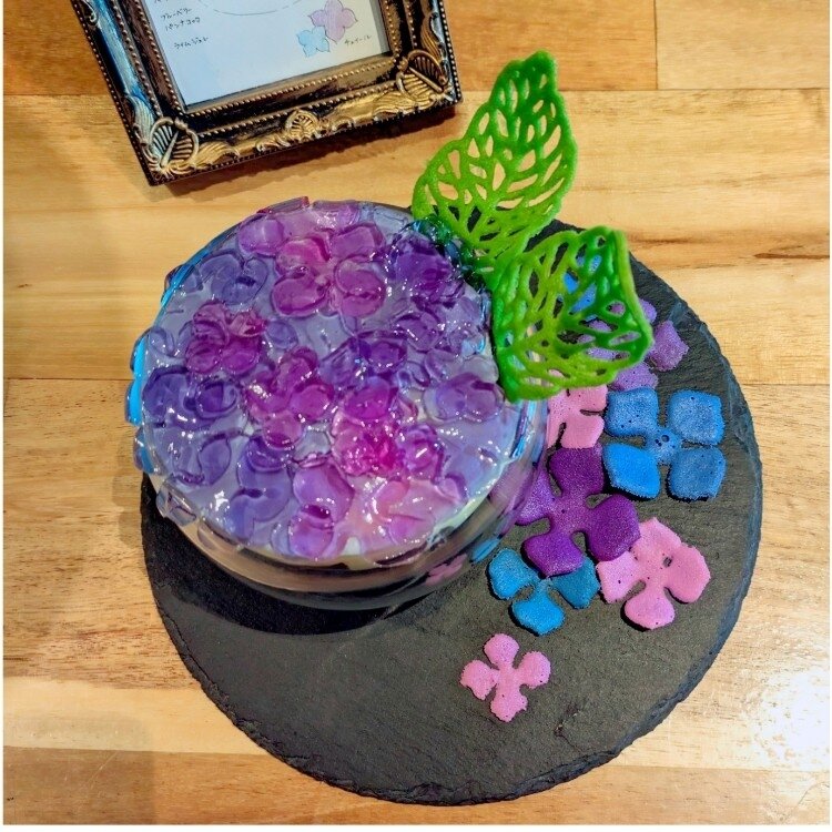 紫陽花の花びらは2色のバタフライピーティーから、プレートに散らされた花びらは、チュイール✨✨