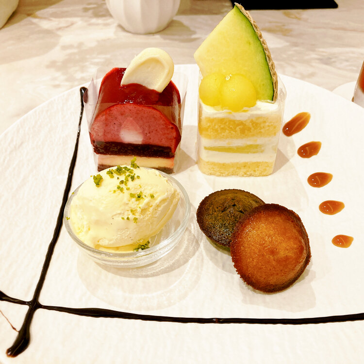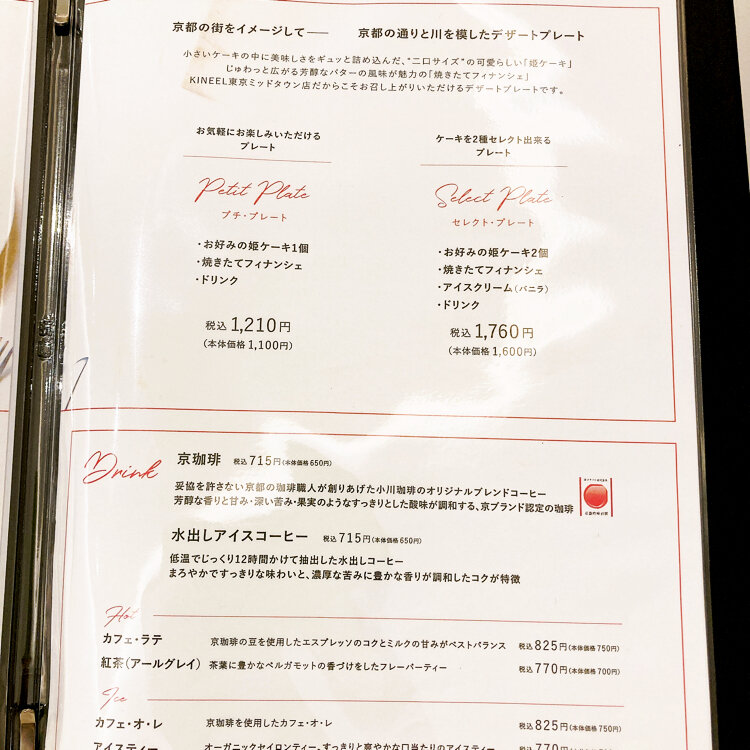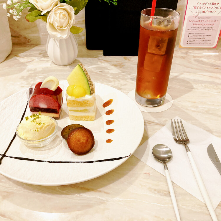 京都に本店を構えるKINEELのイートインでお茶してきました 姫ケーキ2個とフィナンシェのケーキセットを注文です 東京都港区赤坂九丁目7番2号 プラザ地下1階
