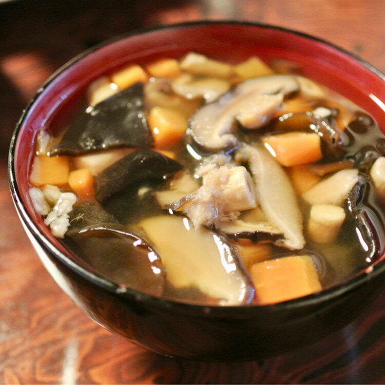 根菜やキクラゲなどを干し貝柱の出汁で煮たお吸い物。