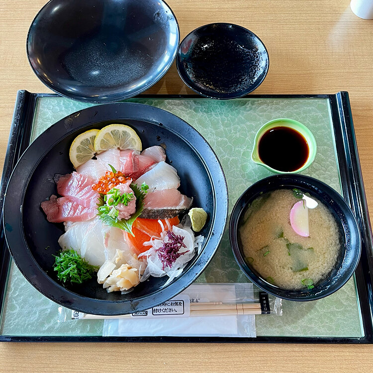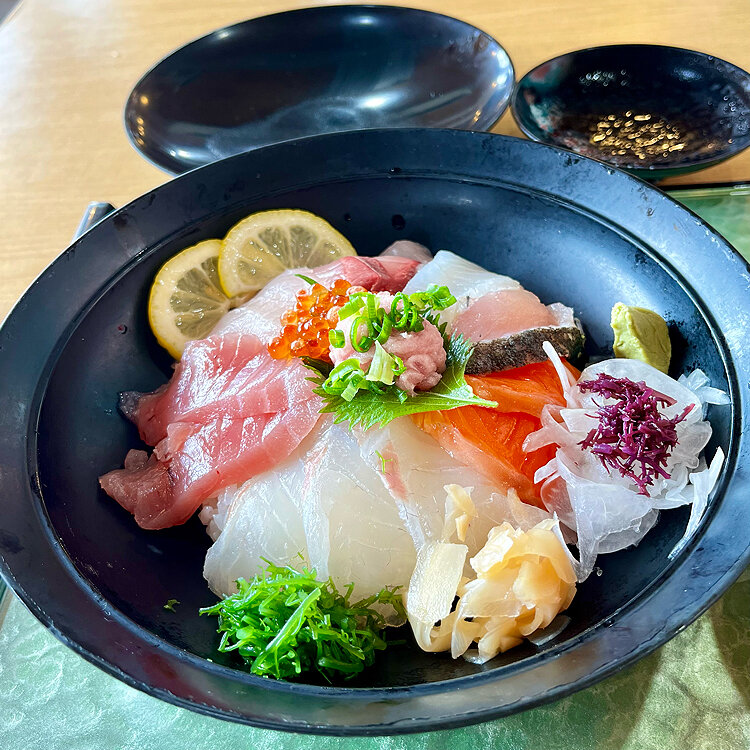 海鮮丼(上)を頂きました。大きくて平らな器にたくさんのお刺身✨