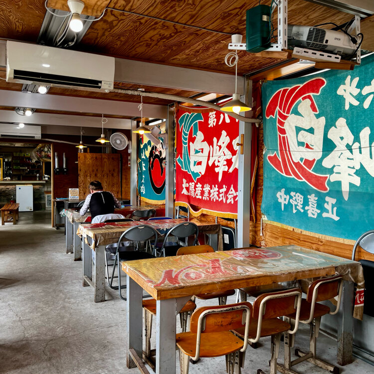 店内には大漁旗や小学校で使っていたような懐かしい椅子など、ふらっと立ち寄れる気さくな雰囲気😊