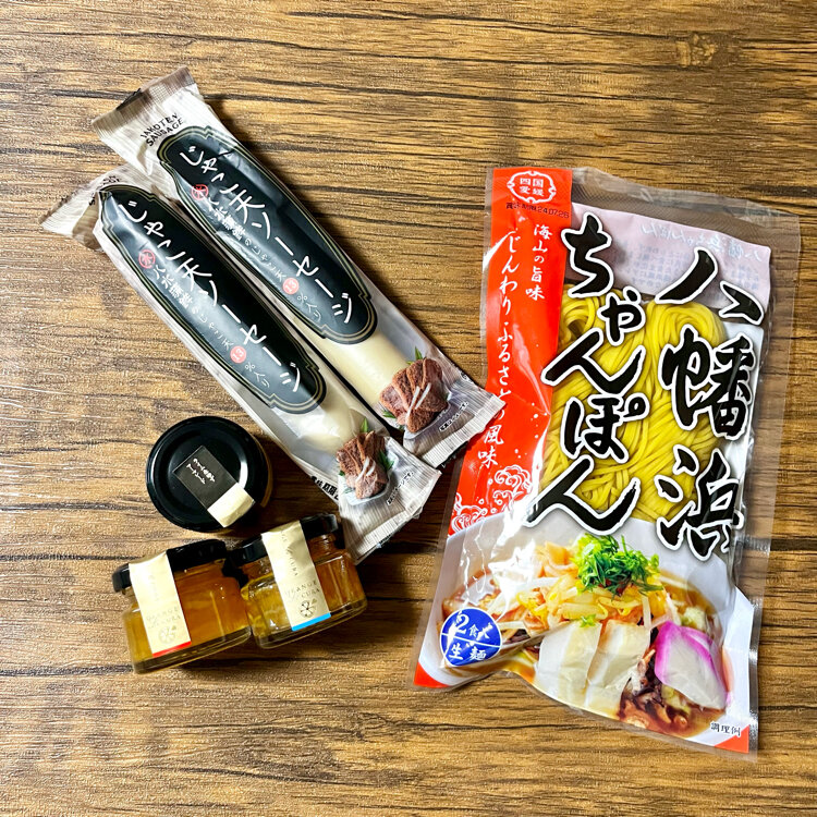 八幡浜のソウルフードといわれるちゃんぽんやじゃこ天ソーセージやジャムなど買いました。
