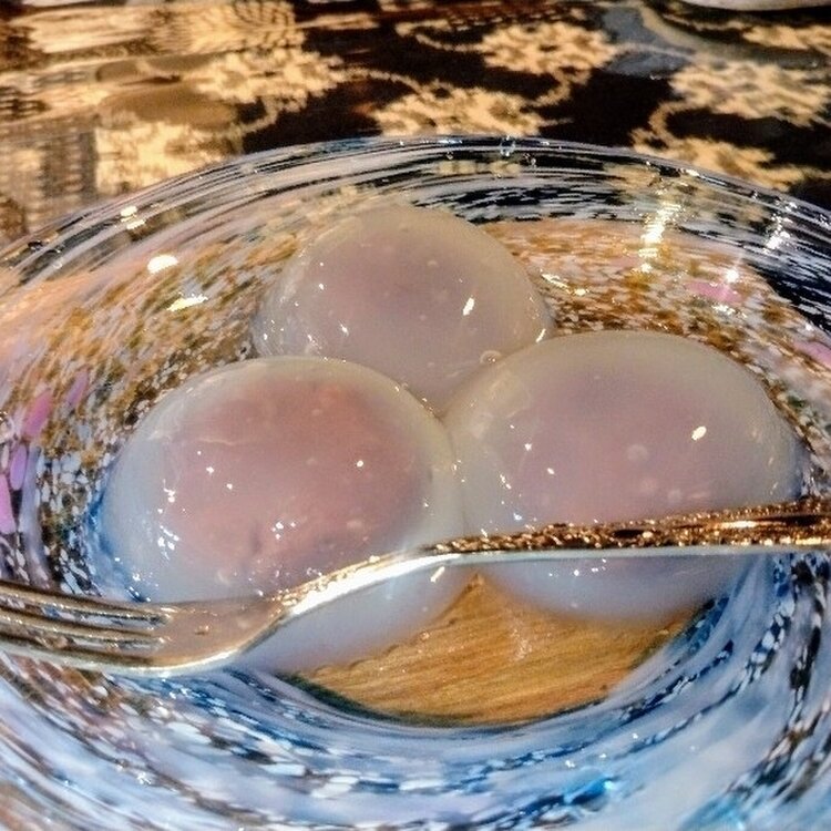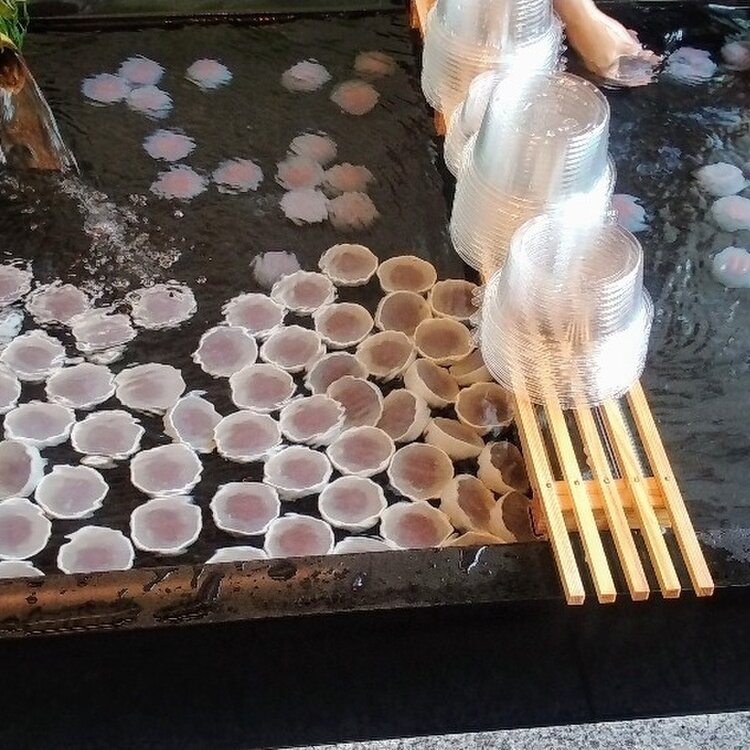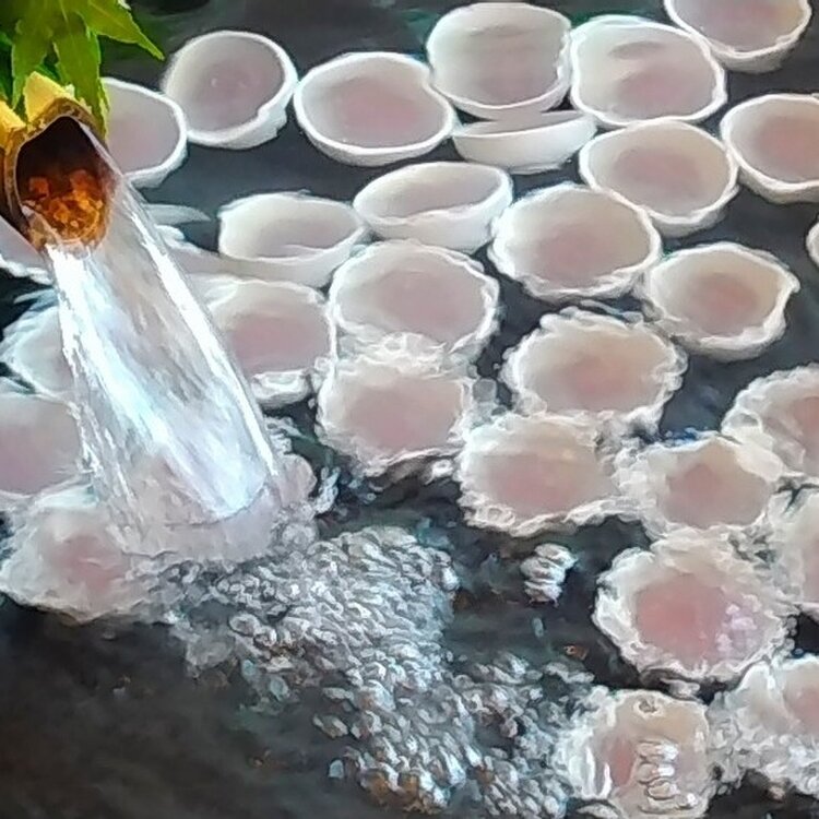 湧き出る清涼な地下水にくずまんじゅうを浮かべます