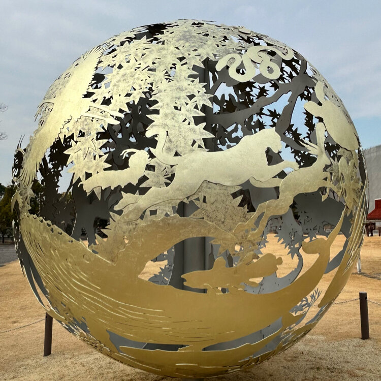 モニュメントに使用された金箔は、株式会社箔一(石川県金沢市)が手がけたもので、持ち込まれた金を伝統工芸士の手技によって10,000分の1mmの薄さに仕上げ、一枚一枚を丁寧に手作業でいのち球に貼りこんでいます。環境配慮とクラフトマンシップの融合で、大阪・関西万博で輝いていた「シャンパンゴールド金箔」の「いのち玉」をまた見られて感動しました。