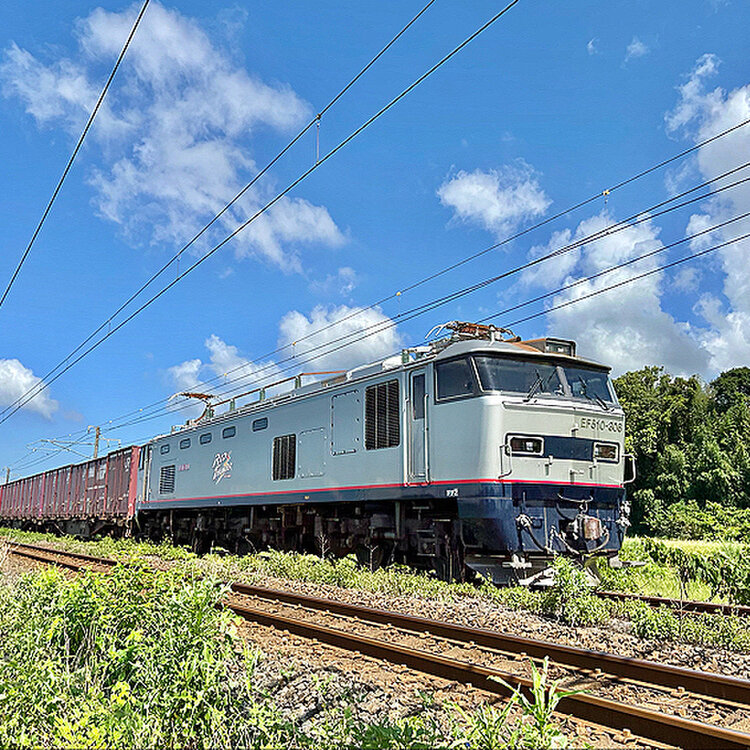 熊本県玉名市岱明町大野下付近(大野下駅周辺) JR貨物、九州向けに銀色のEF510形式300番台 交直流電気機関車。 愛称『ECO-POWERレッドサンダー』 銀なのにレッドサンダー!?