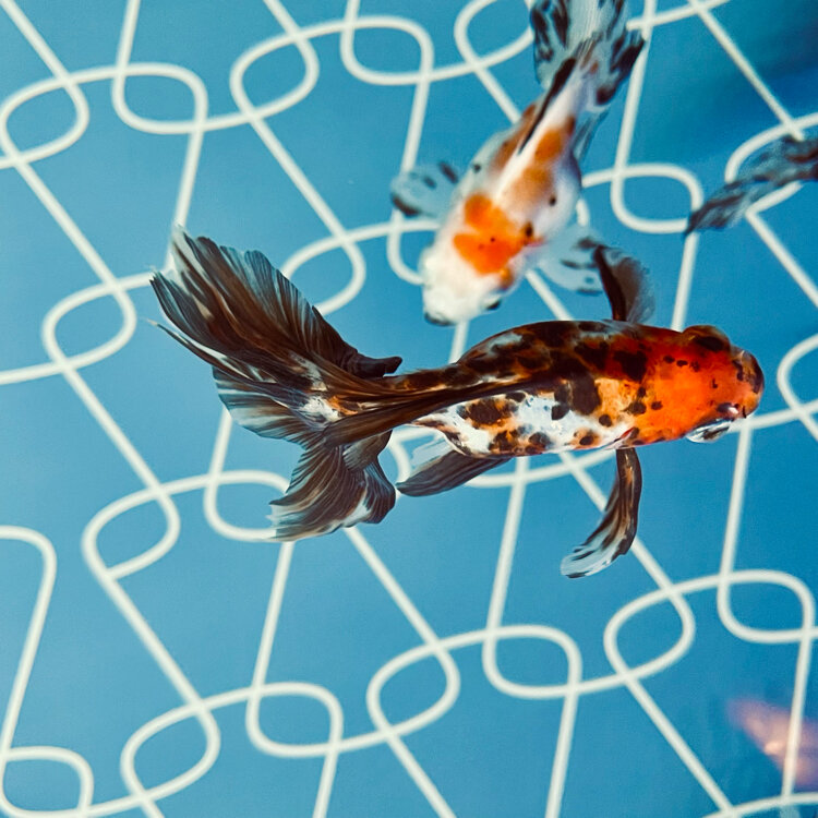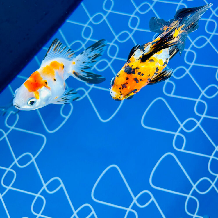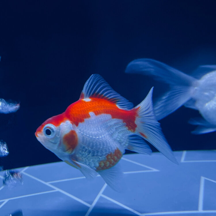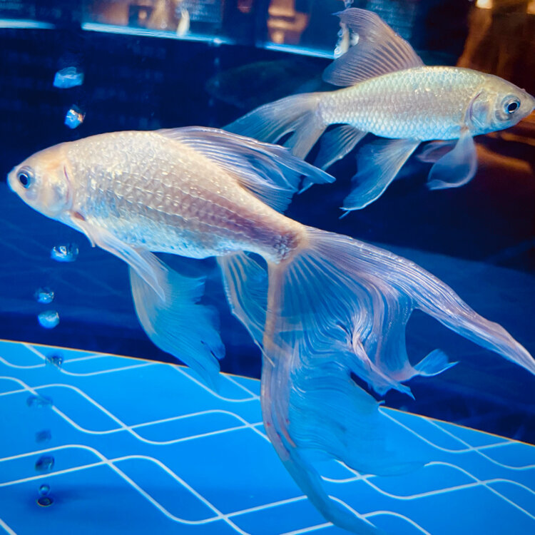 ♢♦︎すみだ水族館④♦︎♢ 鉄魚と金魚 銀色の鉄魚2匹が寄り添うように泳ぐ姿が美しく愛おしかったです…美を追求する鑑賞魚の世界なんですね #すみだ水族館 #金魚#鉄魚#長い尾びれがとても優雅です