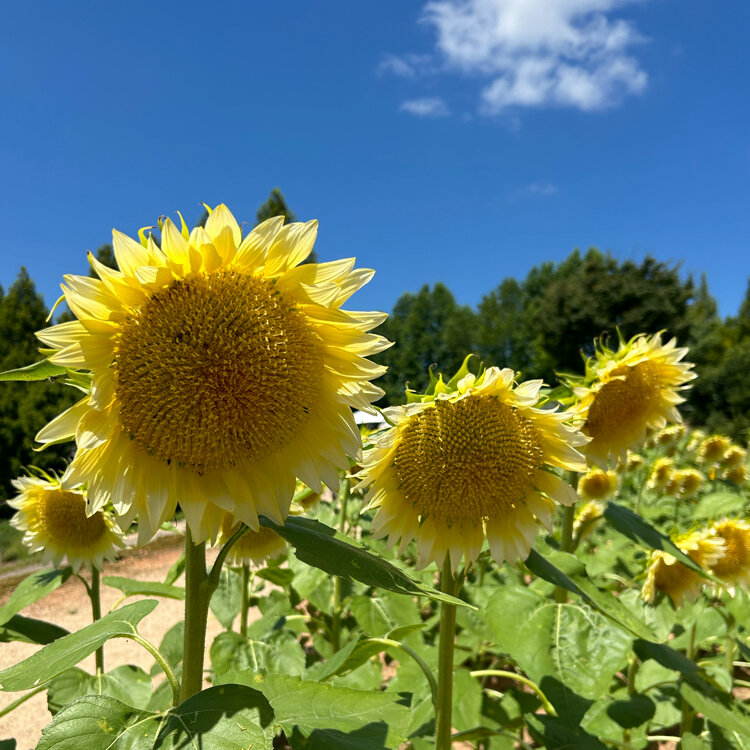 なお🫧さん こんにちは🌞 暑さが和らぎませんねぇ🥵世羅は少しは涼しいかと出掛けましたが、朝から暑さが厳しかったです。 開園8時には間に合わずお目当てのとうもろこし🌽は完売でした😅(花より団子‼️) 青に映えます🌻ひまわりは元気ですねぇ〜💪