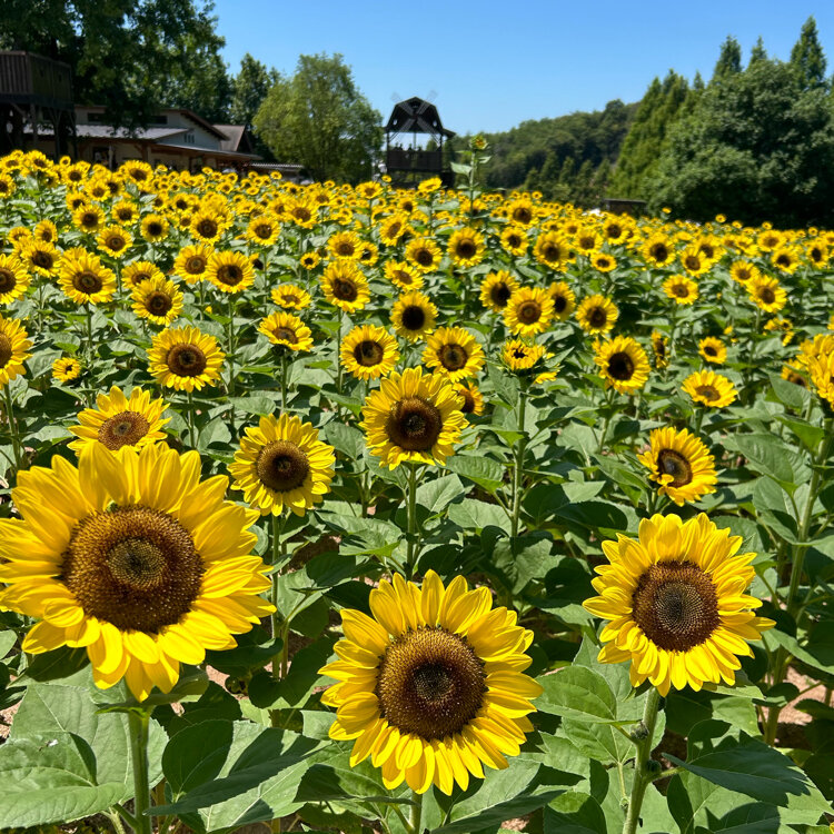 🌻たくさんの種類が太陽を目掛けて咲き競争✨ 15種類はあったかな?『かわいい』の連続💖😊 中でもお気に入りは『ホワイトライト』という花びらが白い🌻ひまわり。 暑すぎる夏を🌞涼しく感じさせてくれるよう👌 摘み取りや迷路、ブランコでの撮影、ハンモックでのんびりなどなど園内で楽しめましたよ👍 だけど、やっぱり暑いですねぇ〜🥵 ありがとう向日葵さ〜ん🎵 #世羅高原農園 #ホワイトライト