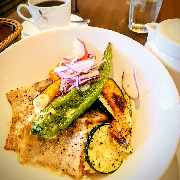 イベリコ豚と夏野菜のトマトスープごはん 右奥のトマトスープをお好みのタイミングでかけて2度美味しいごはん。粗挽きペッパーが良いアクセント。