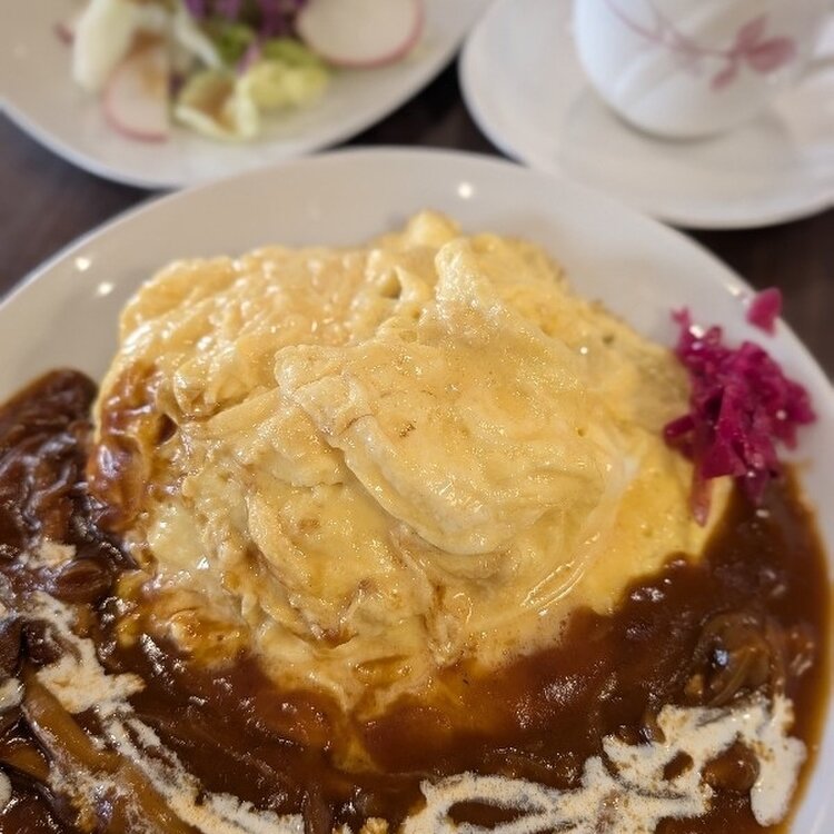 とろとろたまごのオムライス ランチセットのサラダとドリンク デミソースの海に浮かぶオムライス島🏝️ ケチャップライスが良き😋 高倉町珈琲小平店 開店11周年おめでとうございます💐 #とろとろたまごのオムライス #デミソース #ケチャップライス #オムライス #高倉町珈琲 #高倉町珈琲小平店 #開店11周年 #ランチタイム #jun_flat