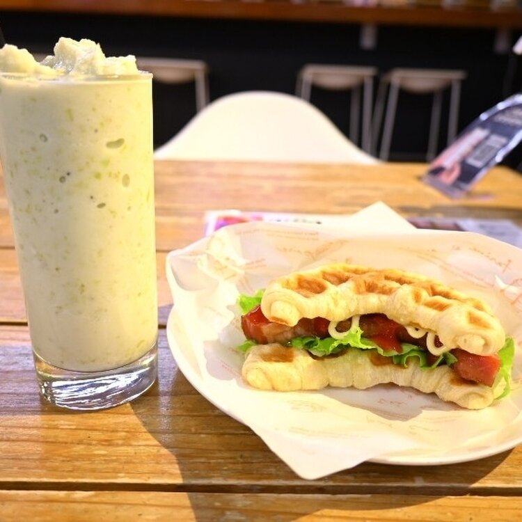 やまなしの美味しいもの #山梨#甲府#シャインマスカット#ベーコン 甲府の街の中心にある物産館 ガラス張りの広々したカフェスペース ワッフル生地のバンズにベーコンとレタスのベーコンバーガー シャインマスカットが贅沢につかわれたシェイク 熱々のバーガーと冷たいシェイク 美味しい山梨 #muuの山梨旅#muuの甲府さんぽ
