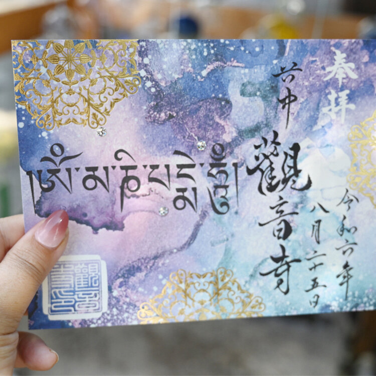 御朱印の背景にキラキラと輝く仏具が描かれていて、