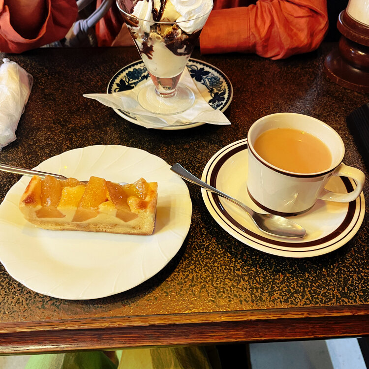 ディープな藤沢を楽しもうということで、むかーし仕事中に偶然入った純喫茶なお店、ジュリアンでお茶しました。 本日はチョコレートパフェと🍎のタルトでおやつ。 間違えなく美味しい😋 チョコもアイスも惜しみなく、🍒も忘れてない王道パフェ。 🍎がゴロゴロ入ったタルト。 若い女の子がたくさんいて、純喫茶て人気あるのね、と今更思いました。