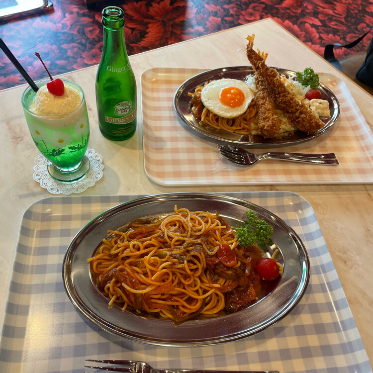 2Fで注文したのは、ナポリタン、エビフライの乗ってるプレート、ジンジャエールとクリームソーダです。