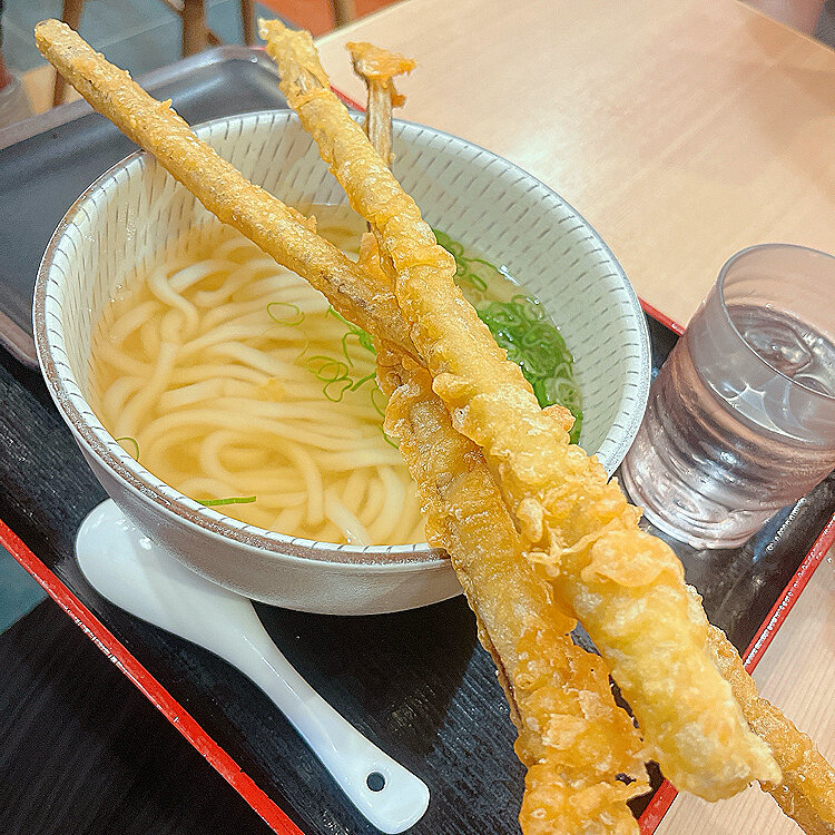 「博多やりうどん」で天下三槍うどんを食べました❣️ 長〜いごぼう天ぷらが3本!!!大迫力のビジュアルでとても驚きました😂 柔らかめのうどんとお出汁がホッとする優しいお味!ごぼう天もサクサクでとても美味しくて大満足でした🥰