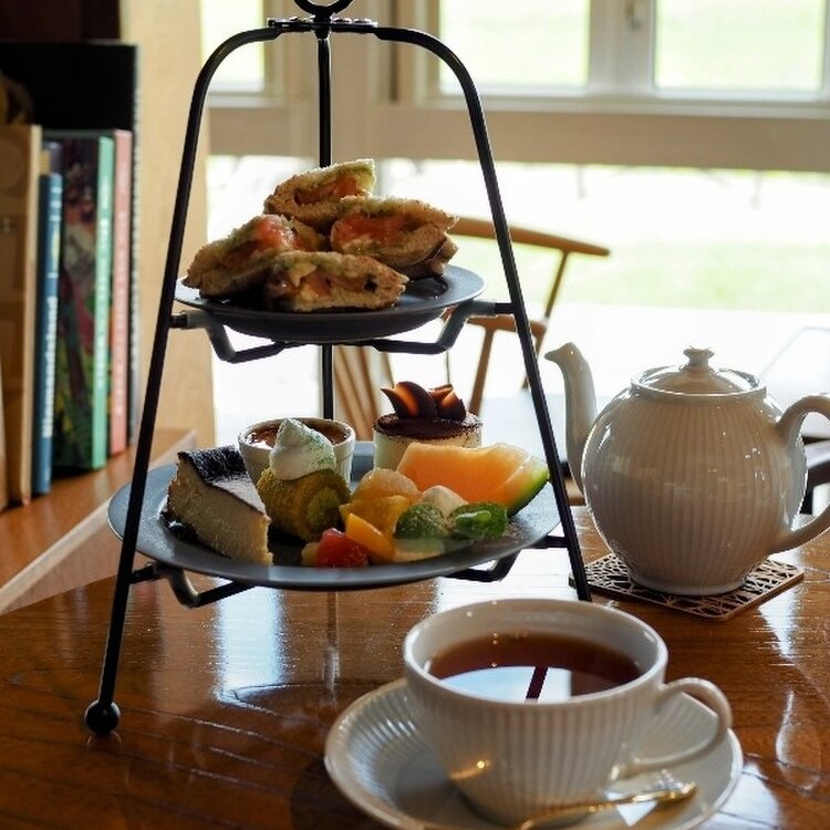 【Littie Taro Cafe】 デザートランチプレートを紅茶のセットで ケーキスタンドにはホットサンドとケーキがいろいろ 紅茶はポットにたっぷり♡ タロカフェさんのスイーツはどれも美味しいのだ♪