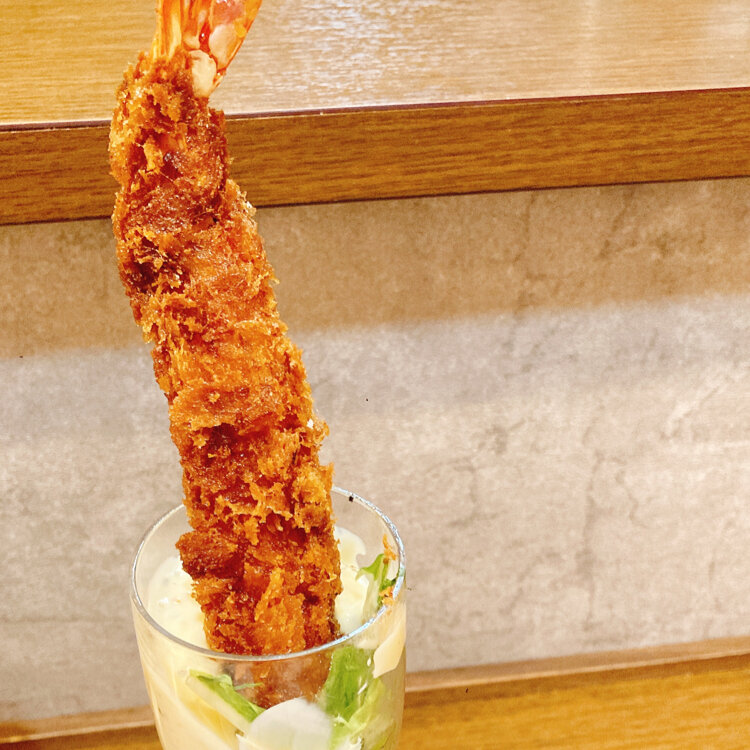 グラスに盛られたエビフライやトッピング豊かな焼き牡蠣、生牡蠣に海鮮を散らしたご飯物と美味しく見栄えもいいメニューがたくさん。