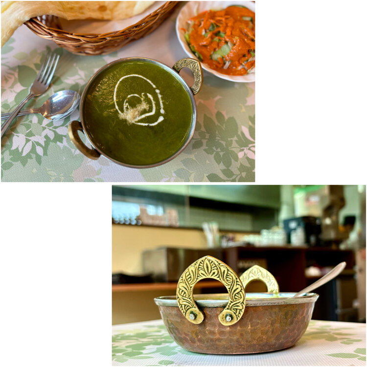 ほうれん草チーズのカレーはポタージュのようにポッテリ濃厚💚甘口にしたのでこれだけでも飲み干せる美味しさ〜😋銅製の器も素敵です😍