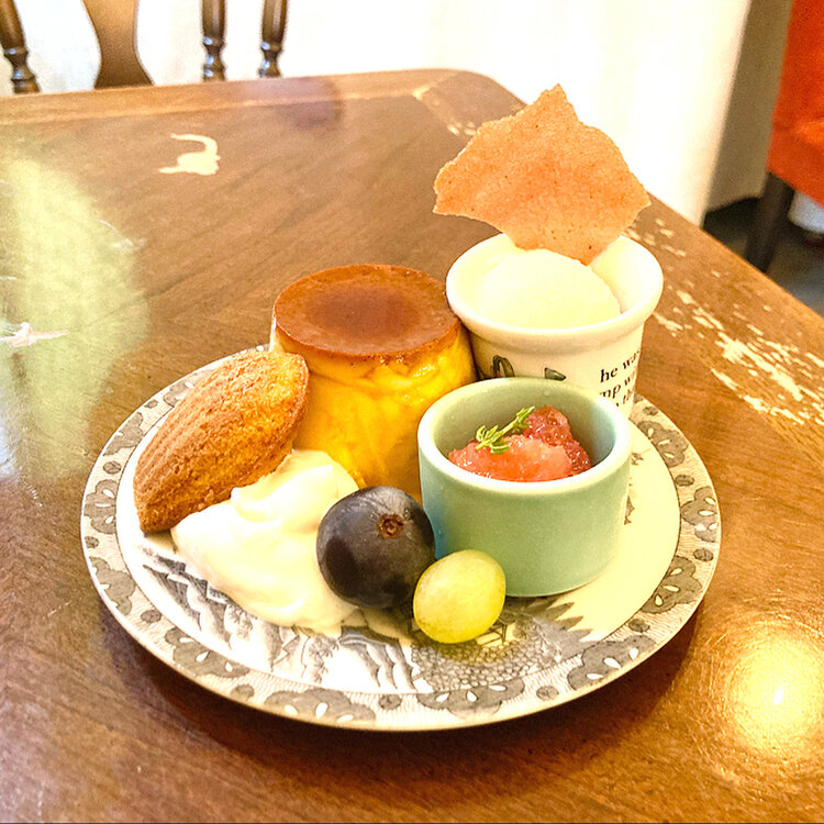 固めのプリンを中心に 🍀クローバはちみつのマドレーヌ、🍨バニラアイス、❁⃘*.゚エルダーフラワーシロップでマリネしたピンクグレープフルーツ、🤍生クリーム、🍇ぶどう、🚩ラズベリーのチュイール