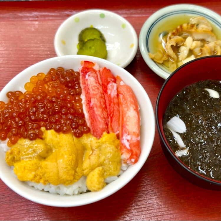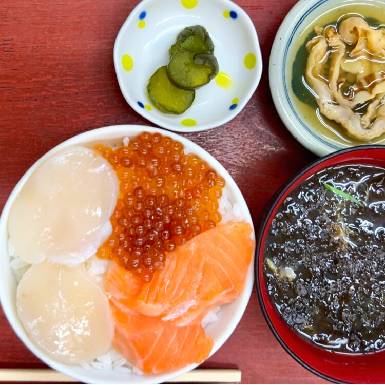 2024.9.16 母とふたり旅🍎 最終日の朝は、函館の朝市へ。 どんぶり横丁内の櫻桂(おうけい)さんにて、海鮮丼をいただきました🦀 他のお店同様、大きいサイズの海鮮丼も充実していたのですが、小さいサイズの丼ぶりに好きな具を3種乗せれられる海鮮丼もあり、それに決定!