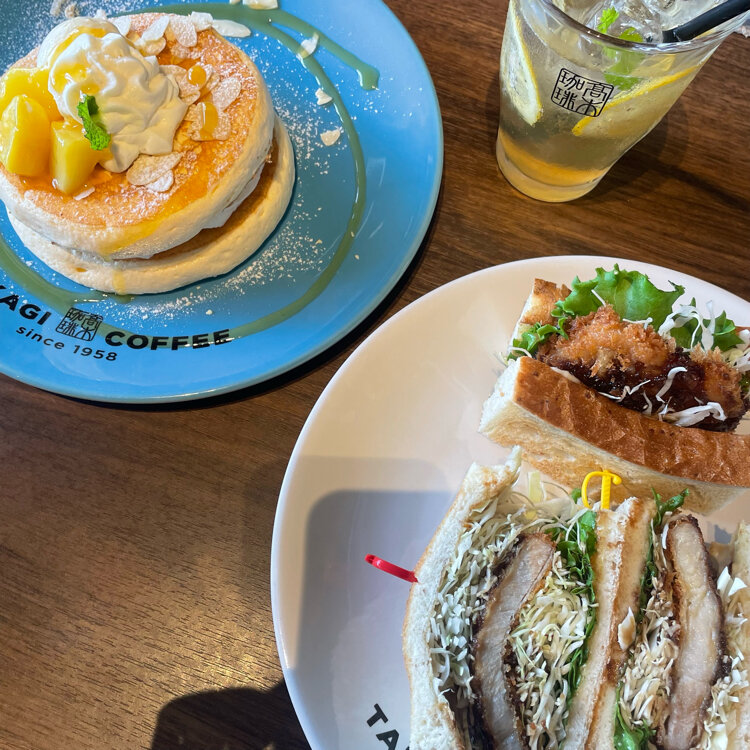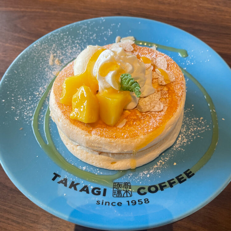 【長野・松本】高木珈琲へ! ・ ・ イオンの敷地内に『高木珈琲』があったので、ランチをしてきました。 ナポリタンにカツサンドにフレンチトーストと、飲み物はコーヒーやレモネードを頼みました。 ・ そして、1番気になっていたパンケーキも。マンゴーのパンケーキを頼みました。 ふわっとした生地に甘いマンゴーソースがめっちゃ美味しかったです♡ マンゴーの果肉も乗っていて、満足でした。 ・ ・