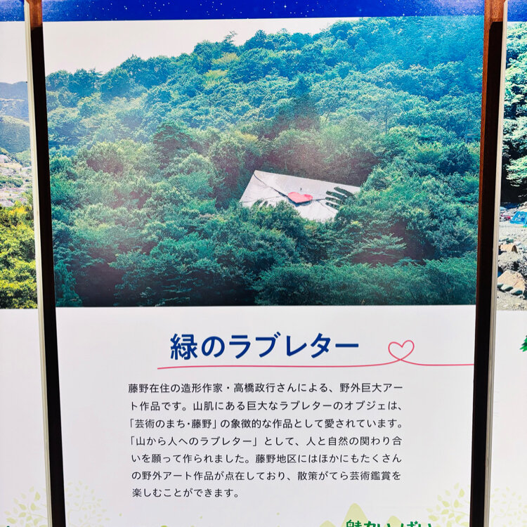 藤野在住の造形作家・高橋政行さんによる、野外巨大アート作品です。山肌にある巨大なラブレターのオブジェは、「芸術のまち・藤野」の象徴的な作品として愛されています。